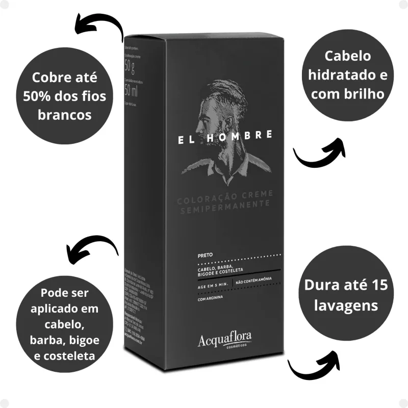 Acquaflora El Hombre apresenta uma coloração semipermanente, que realça a cor dos cabelos masculinos e devolve uma aparência natural e sofisticada.Tonaliza suavemente os fios, com cobertura de até 50% dos cabelos brancos, com predomínio dos reflexos acinzentados para um resultado mais natural e discreto.Sua fórmula com arginina, de fácil e rápida aplicação, hidrata e devolve o brilho aos fios, além de não agredir o couro cabeludo.